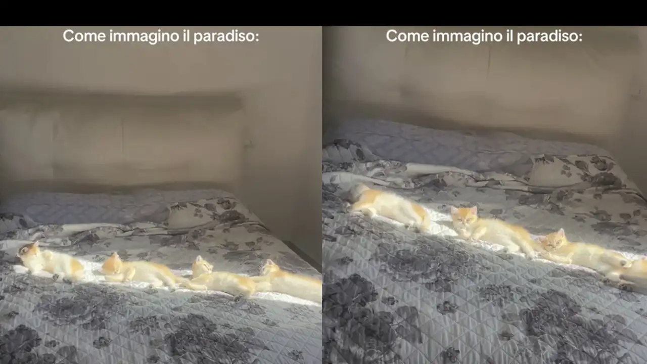 Котята уютно устроились на лучике солнца на кровати, наслаждаясь теплом и светом. Они мирно отдыхают, лежа на полосе солнца, и выглядят невероятно мило.