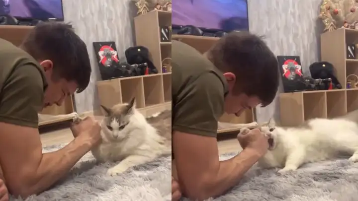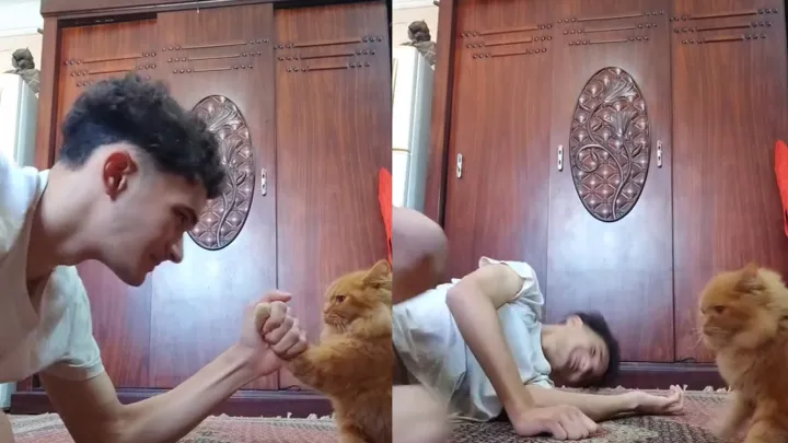 Парень устроил состязание по армрестлингу с котом и проиграл Жалкий человечишко.Пушистый победил своего хозяина в армрестлинг и был весьма доволен собой Достойный соперник.