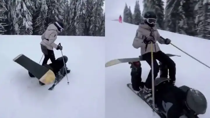 Дуэт сноубордиста и лыжницы создал любопытный аттракцион для спуска со склона