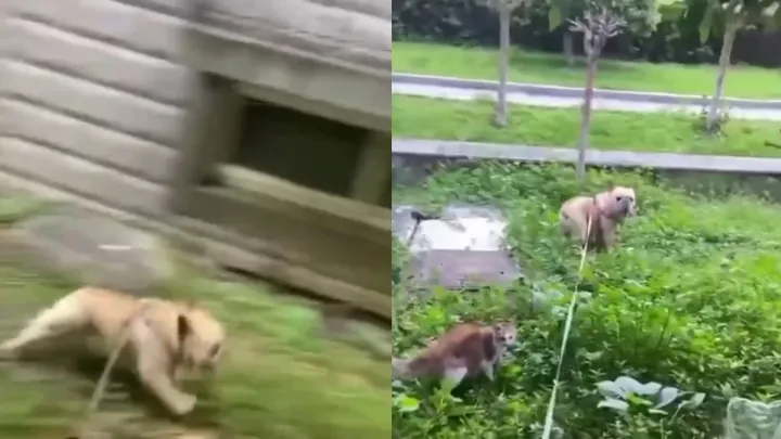 Подлый хозяин обманул песика в забеге, из-за чего тот был сильно возмущен Забег у песеля совсем не задался.Забавные возгласы убегающего от кота бульдога напоминают испуганного мужичка «Ай-яй-яй-яй!»