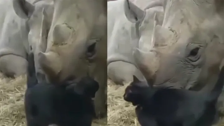 Бесстрашный кот решил подружиться с носорогом, и тот ответил взаимностью