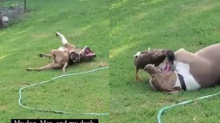 «Утка, что ты делаешь, а-ха-ха, прекрати!»: уточка защекотала своего друга пса