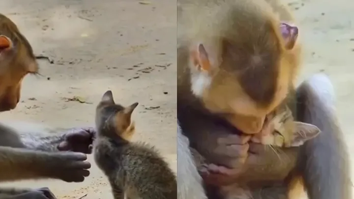 Обезьяну Абу усыновила кошка, и теперь она постоянно носит её на своём животе