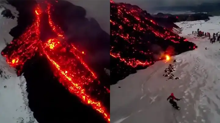 Группа сноубордистов скатилась с горы в опасной близости с лавой