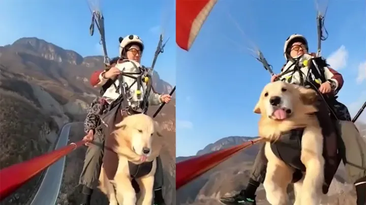 Китаянка взяла в полет на параплане своего золотистого ретривера