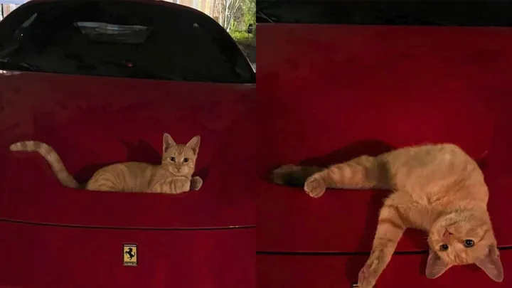 На фото сняли то, для чего на самом деле нужно углубление в капоте Ferrari Для комфорта котиков, конечно же.