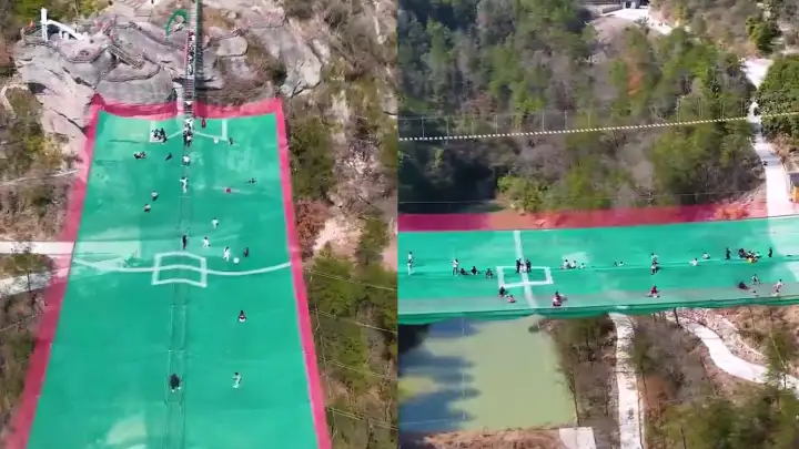 В Китае между двух гор на высоте 20 метров натянули сетку для игры в футбол