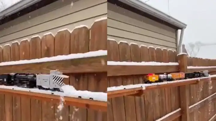Энтузиасты собрали игрушечный паровозик для очистки забора от снега