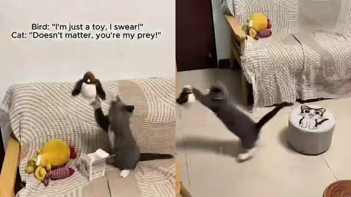 На видео сняли игрушечную летающую птицу, которая натаскает любого кота на охоту