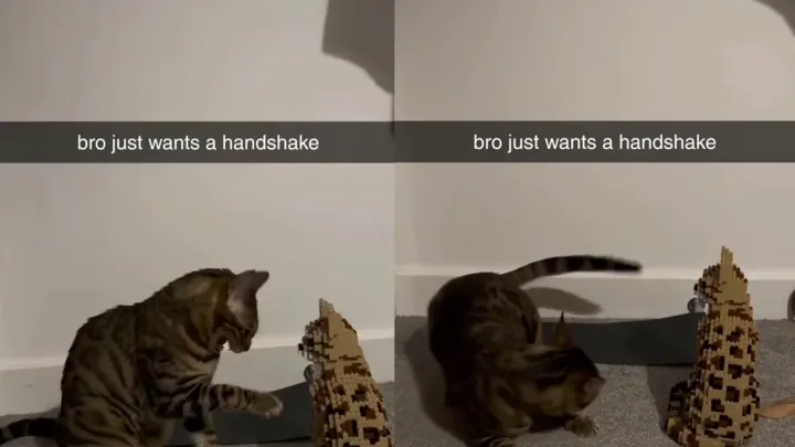 «Лапу пожми!»: кот остался недоволен неприветливостью своей копии из лего