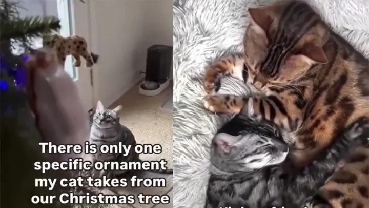 Кот, обожающий елочную игрушку, похожую на его брата, растрогал Сеть