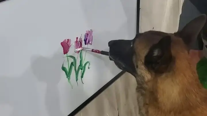 Пес Обезьянка умеет рисовать кистью и акрилом, и его картины пользуются спросом