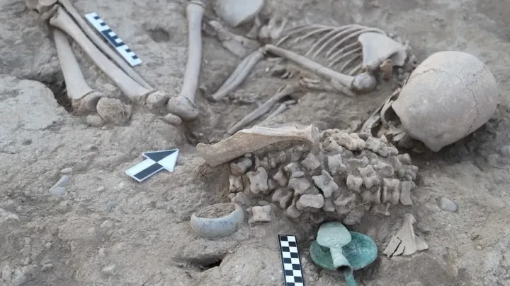 В Казахстане раскопали курган девушки бронзового века С девушкой захоронено много костей и бронзовый диск.