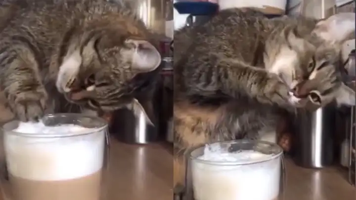 Кот проверил молочную пену в кофе хозяина и был очень доволен собой