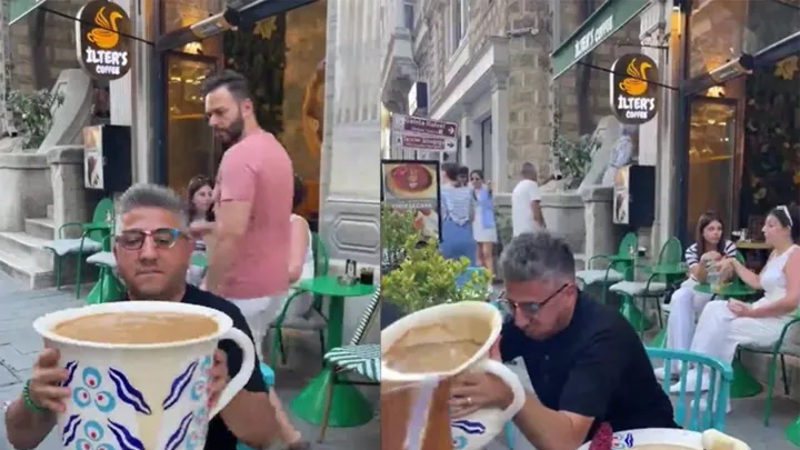 Мужчина заказал огромную чашку кофе, но явно переоценил свои силы
