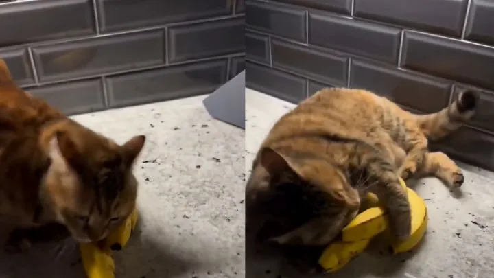 Кошка почему-то приняла бананы за своих котят и принялась их защищать