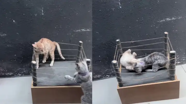 Жесткий бой двух пушистиков на мини-ринге был снят на видео