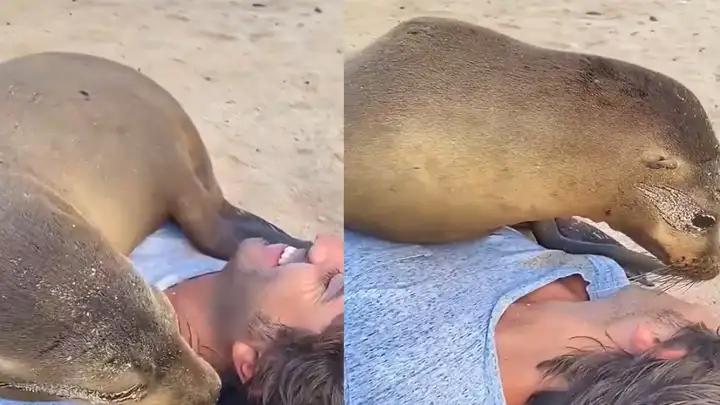 «Привет, человек»: общительный морской котик атаковал парня обнимашками