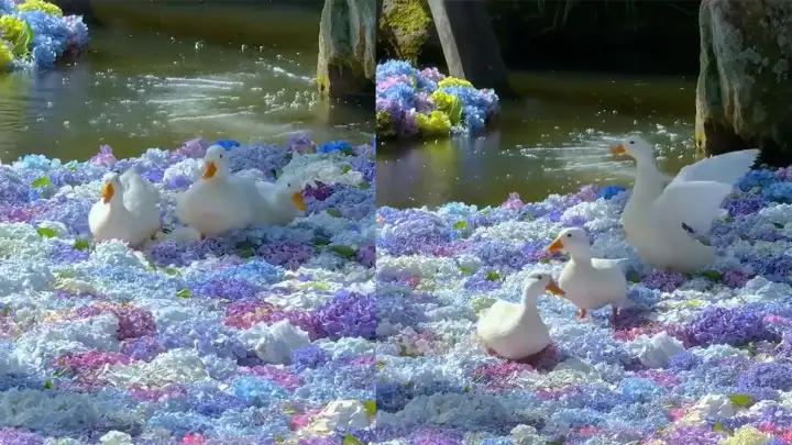 Уточки, гуляющие среди гортензий, любому поднимут настроение