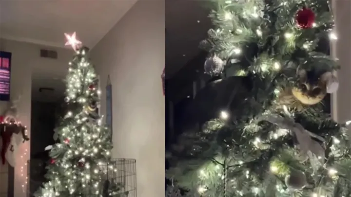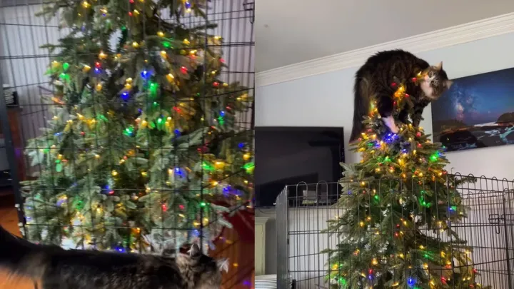 «Буду мишурой»: кот запутался в новогодней елке и стал главным ее украшением