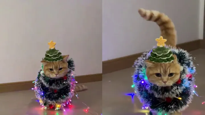 Кота нарядили в новогоднюю елку и обмотали гирляндой, но его это не смутило