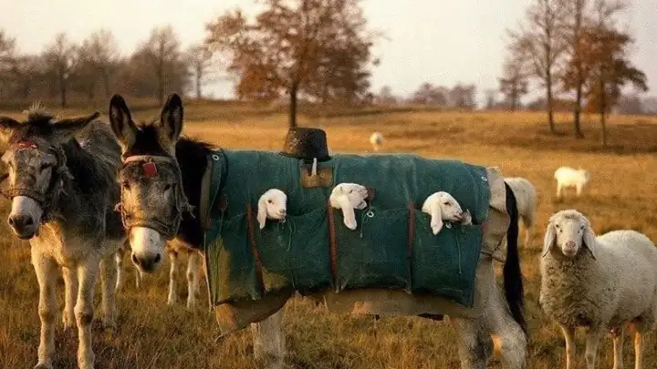 Ослики-няньки: в Италии ослики носят ягнят в сумках, чтобы те не отставали