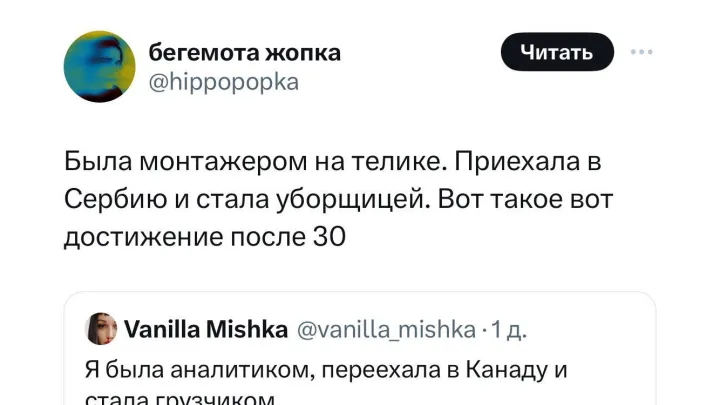«Я у мамы инженер»: на видео попал удивительный способ экспресс-переезда Главное — полотно брать покрепче.Люди 30+ поделились своими «достижениями» после переезда в другую страну У некоторых бывает крайне неудачный опыт переезда.