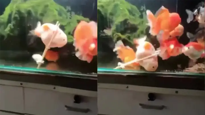 Хозяин сделал для рыбки костыль, позволяющий нормально есть и плавать