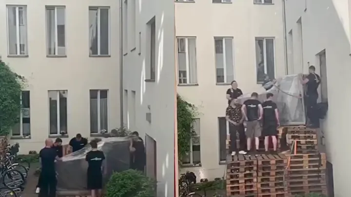 Ребята нашли способ поднять рояль на второй этаж с помощью десятков поддонов Было бы желание, а способ занести рояль на второй этаж всегда найдется.