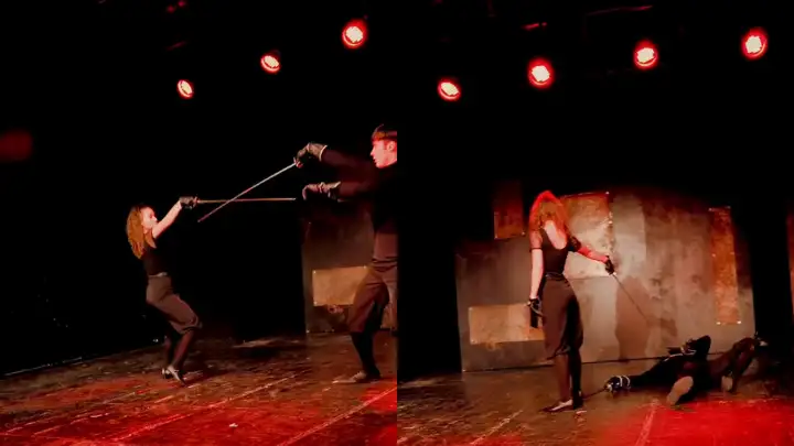 Театральное фехтование: двое фехтовальщиков сделали вид спорта представлением Сочетание спорта и искусства.