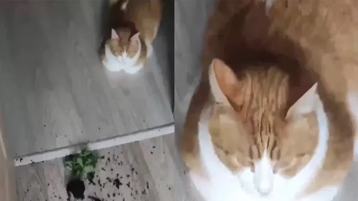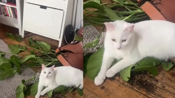 Легендарная битва: кот сразил растение наповал и был очень доволен собой