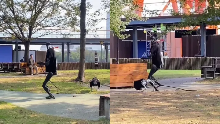 Обычная утренняя прогулка: на видео сняли робота, выгуливающего своего робопса