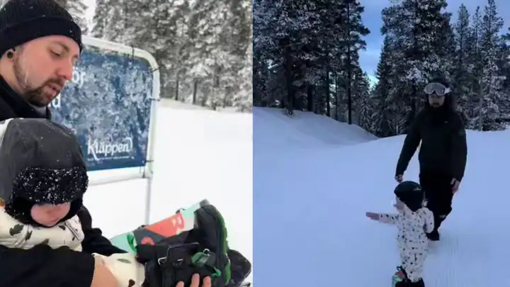 C папой нескучно: на видео сняли, как отец учит свою кроху ездить на сноуборде