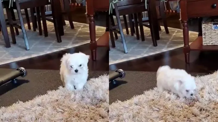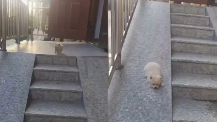 «Уи-и-и»: крохотулечный щенок нашел способ быстрого спуска с лестницы