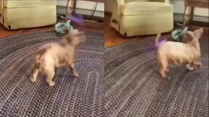 Щенок игрался с кольцом и случайно удачно сыграл в кольцеброс с хвостом