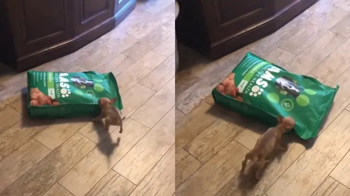 «Все мое!»: крохотуличный песик решил припрятать себе целый мешок корма