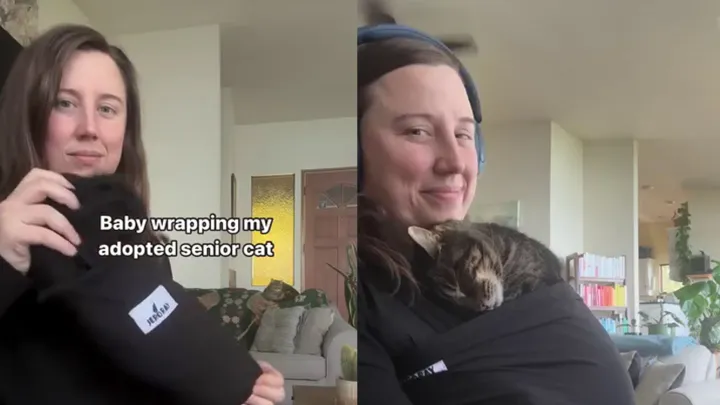 Девушка использует слинг-шарф для своего взрослого кота, и это невероятно мило