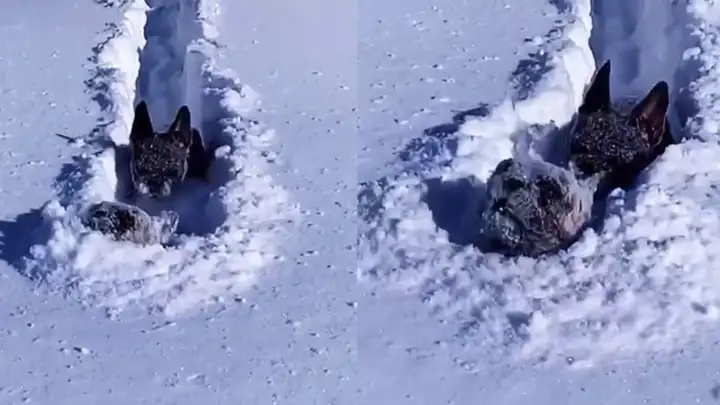 Два песеля показали свою мощь, проложив себе тропинку в огромных сугробах