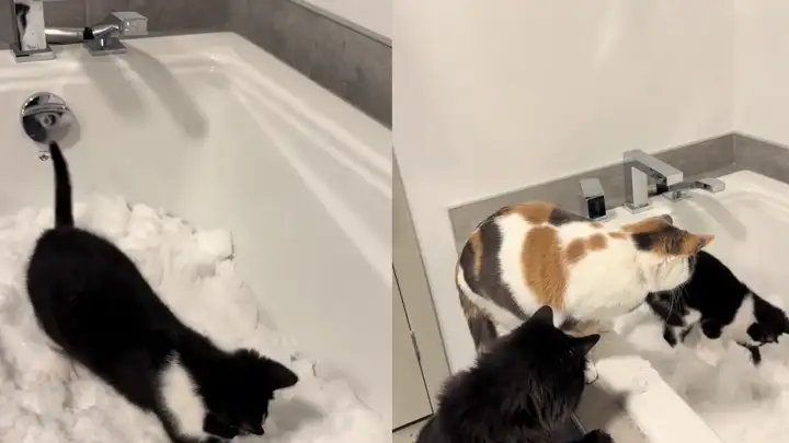 Хозяева наполнили ванну снегом, чтобы показать его своим пушистым любимцам