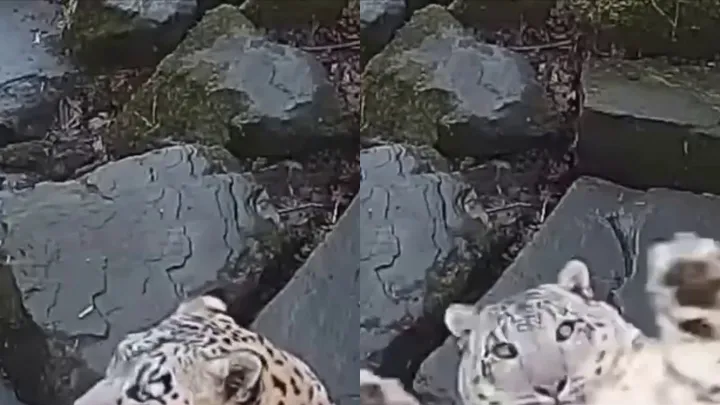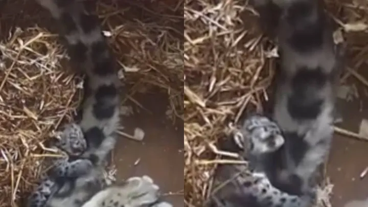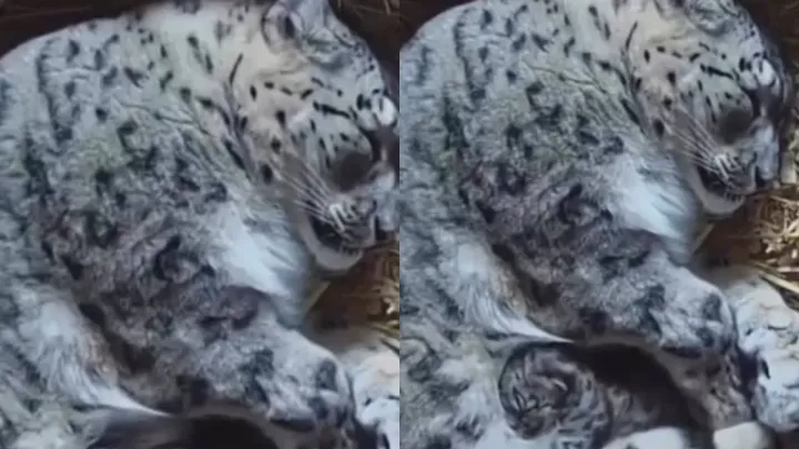 Снежный барс испугался новой камеры наблюдения в вольере и уморил соцсети Типичный котик.Маленький снежный барс обнимает мамин хвост, и это невероятно мило Так малютка чувствует себя в безопасности.
