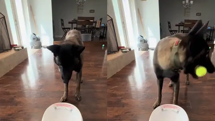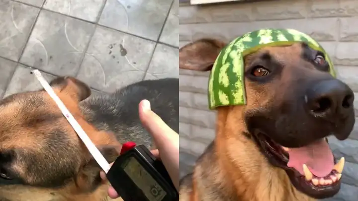 Человек снял на видео процесс изготовления арбузного шлема для своей овчарки