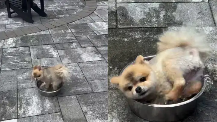 «Надо освежиться»: мини-песель использовал миску в качестве бассейна