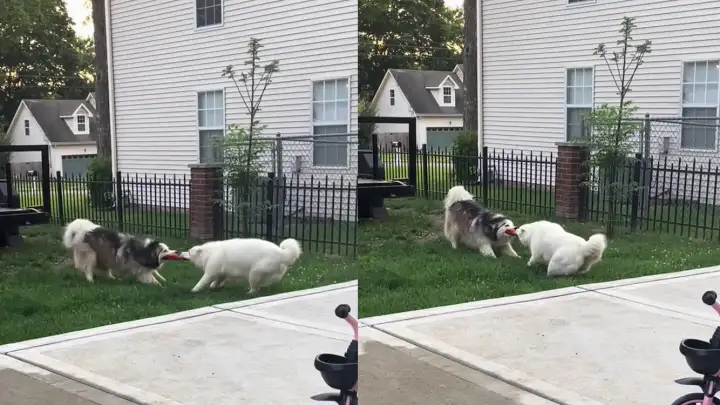Два песеля не поделили игрушку и исполнили синхронный танец