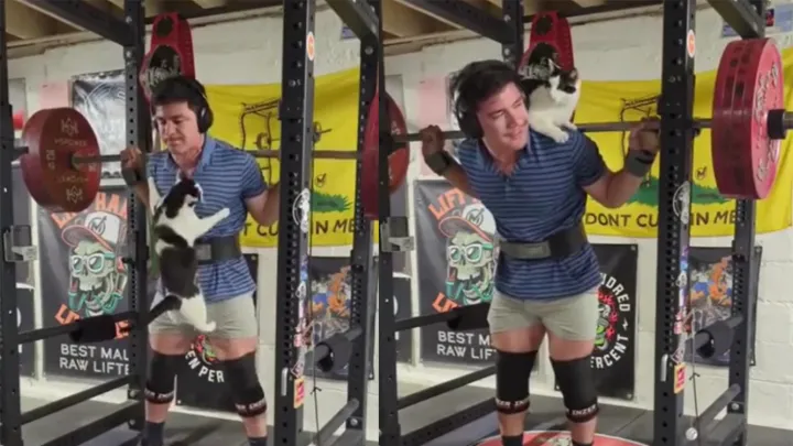 «Не расслабляйся»: кот помогает человеку бить рекорды в тяжелой атлетике
