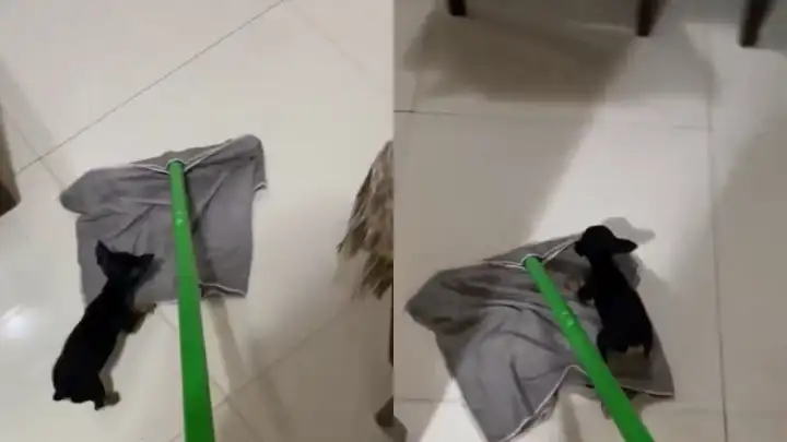 «Постой! А можно я с тобой?»: пес, катающийся на тряпке, не дает хозяйке мыть пол