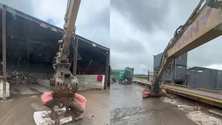 На видео сняли, как экскаватор протирает улицу матрасом вместо губки