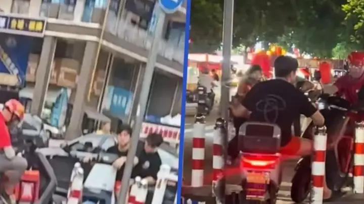 Китайский курьер и мотоциклист 4 часа не уступали друг другу на узком переходе