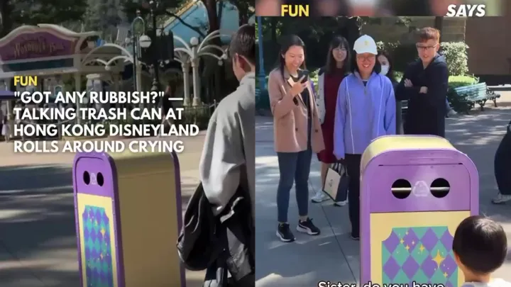 В гонконгском Диснейленде катается говорящая урна Push the Talking Trash Can Даже мусорка стремится к общению.