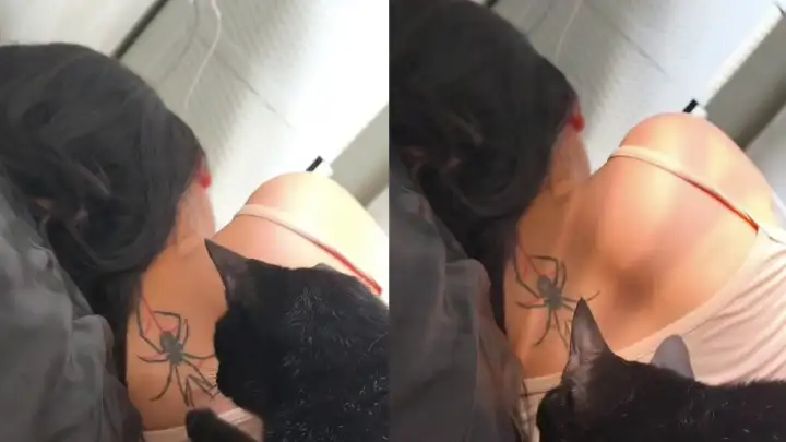 Слишком реалистичное тату: кот устроил охоту на паука, набитого на спине хозяйки