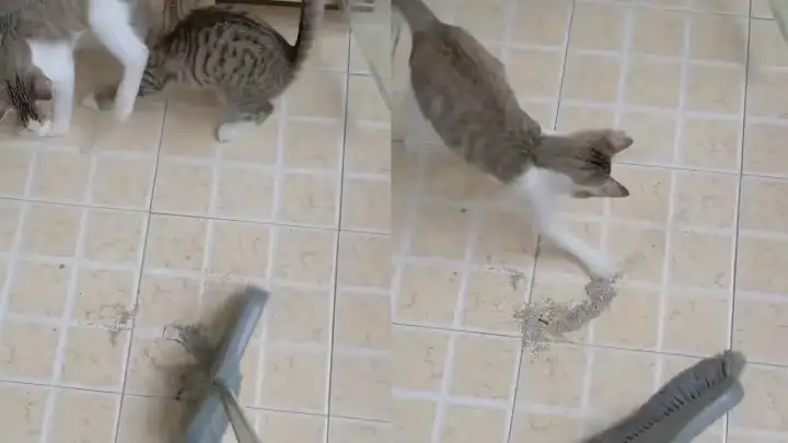 «Больше грязи!»: коты показали свое отношение к чистоте, мешая хозяйке подметать